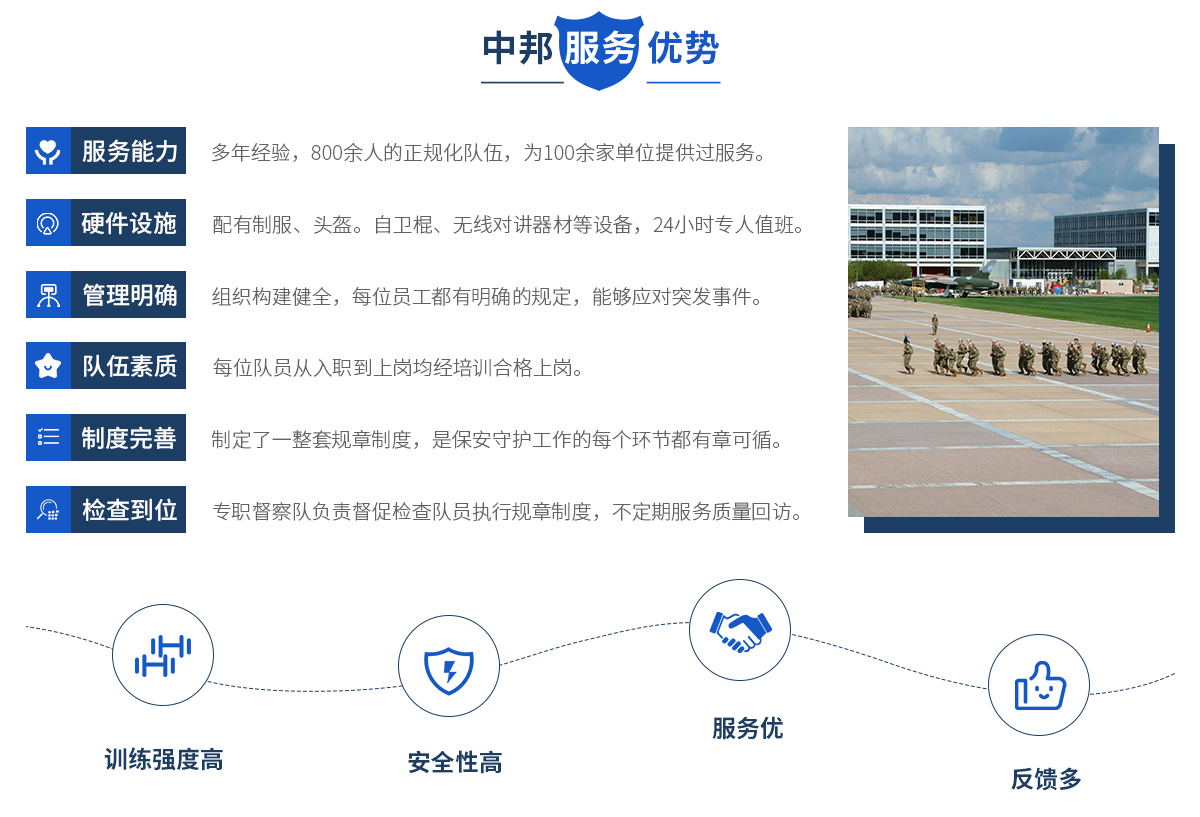 中邦服務(wù)簡介 安徽中邦保安服務(wù)有限公司總公司成立于2019年。公司 成立以來,始終以“文明值勤、優(yōu)良服務(wù)、客戶至上、安全為先” 為宗旨,以保一方平安為已任,面向社會(huì)各界等提供有償保安護(hù) 衛(wèi)、技術(shù)防范、保安培訓(xùn),是一家專業(yè)化保安服務(wù)公司。目前, 公司下為200多家客戶單位提供周到安全的保安服務(wù),遍布全省 及周邊地區(qū),現(xiàn)有各類專業(yè)人員和保安員2000余名。 中邦服務(wù)宗旨 安徽中邦保安服務(wù)有限公司是為適...
